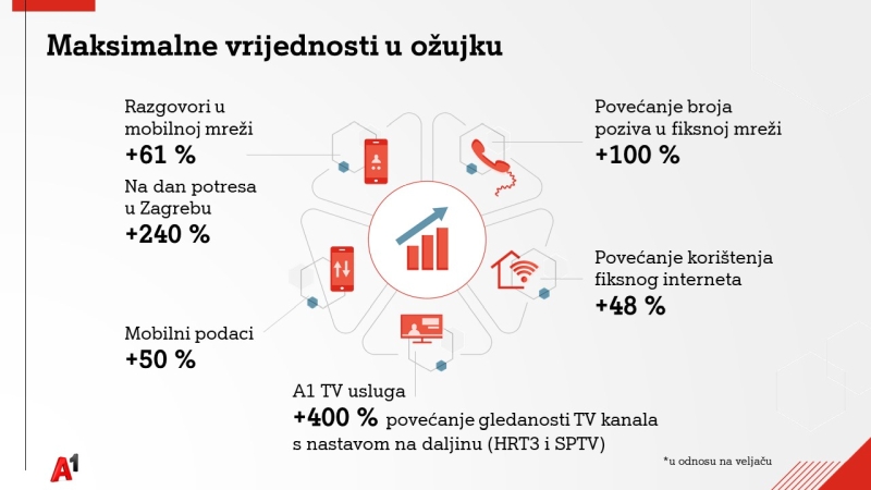 Spomenuto testiranje obuhvatilo je i krizno razdoblje pojave pandemije koronavirusa koja je snažno utjecala na promjenu životnih navika korisnika u Hrvatskoj. Kako su se one odrazile na korištenje telekomunikacijskih usluga pokazuju podaci iz ožujka ove godine. S uvođenjem mjera izolacije u ožujku naglo je poraslo korištenje svih telekomunikacijskih usluga. Razgovori u mobilnoj mreži rasli su za 60 posto, osobito na dan potresa čak 240 posto, a broj poziva u fiksnoj rastao je 100 posto. Prijenos mobilnih podataka povećao se 50 posto, a korištenje fiksnog interneta 50 posto. Za čak 400 posto porasla je gledanost HRT3 i SPTV kanala preko kojih se odvijala nastava na daljinu. Osim što su korisnici više koristili A1 usluge u svrhu edukacije i rada na daljinu, rasla je i potražnja za zabavnim sadržajima, pa su se popularni streaming servisi poput YouTubea, Netflixa i Facebook videa u ožujku koristili u prosjeku 100 posto više nego u veljači.