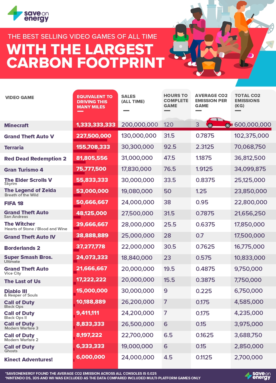 - SaveOnEnergy otkrio je da je kombinirana emisija CO2 za prvih šest najprodavanijih igara 841.131.250 kg – to je ekvivalent putovanja oko svijeta 75.064 puta.