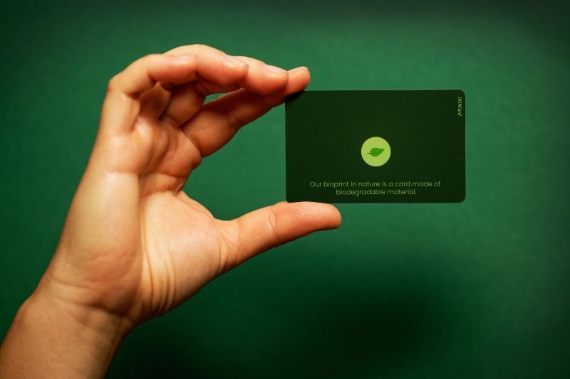 Odnedavno se u AKD-ovim smartcard pogonima u Savskoj mogu izraditi kartice od biorazgradivog i eko materijala. Ovakve kartice jedinstven su proizvod na našem tržištu, a idealan su izbor za klijente kojima su briga za okoliš i održivost u središtu poslovanja. Kartica „Prijateljica prirode“ je biorazgradiva kartica na bazi žitarica koja je otisnuta i personalizirana prirodnim bojama. Uz eko-friendly kartice, dostupni su i prateći eko etuiji koji su, također, izrađeni od biorazgradivog materijala.