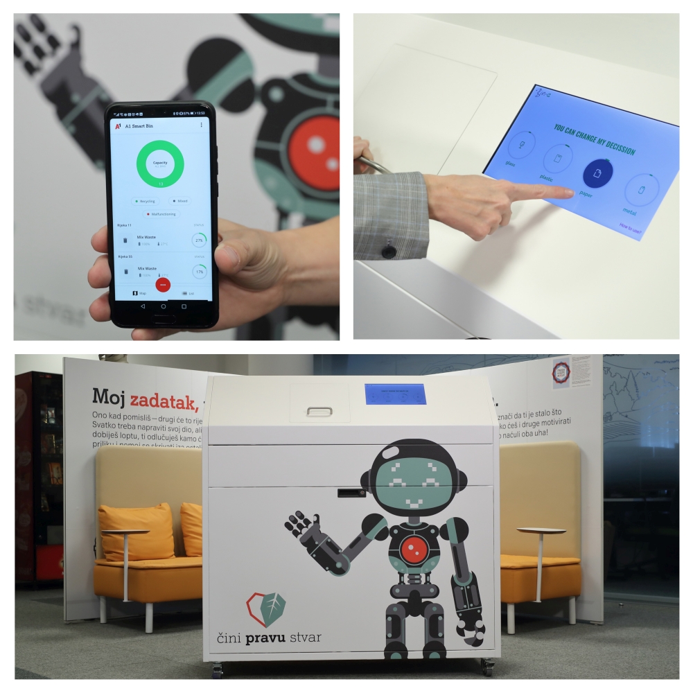 Treći model također je namijenjen zatvorenim prostorima. Naziv pametnog spremnika stekao je zahvaljujući primjeni umjetne inteligencije koja senzorimai kamerama prepoznaje vrstu otpada te je automatski razdvaja u odgovarajući spremnik. Osim toga, principom strojnog učenja prilikom svakog prepoznavanja vrste otpada uči, nadopunjuje bazu znanja i dijeli s ostalim spremnicima u sustavu. Opremljen je s četiri unutarnja spremnika koji se mogu prilagođavati za različite vrste otpada prema potrebama korisnika kao i prešom za povećanje kapaciteta. „Zahvaljujući IoT cloud platformi, u svakom je trenutku na daljinu moguće provjeriti status popunjenosti spremnika kako bi se moglo efikasno planirati pražnjenje. Na mapi se prikazuje lokacija spremnika, status popunjenosti te je moguće kreirati optimalne rute obilaska čime se značajno smanjuju operativni troškovi. Uz to, dostupna je analitika i obavijesti, a s obzirom na to da je rješenje u oblaku nije potrebna posebna korisnička IT infrastruktura“, objasnio je Siniša Staničić, direktor ICT prodaje i rješenja u tvrtki A1 Hrvatska.