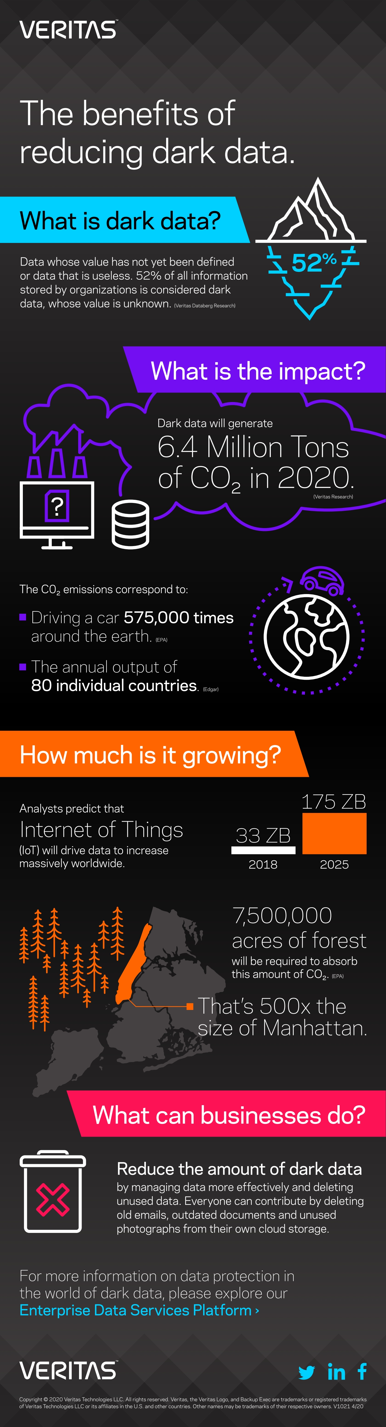 Veritas Technologies, globalni predvodnik u sustavima za zaštitu i raspoloživost podataka, procjenjuje kako se godišnje u atmosferu ispusti oko 6,4 milijuna tona CO2 zbog napajanja sustava koji čuvaju ove nepotrebne podatke. Kako bismo zaštitili planet od viška CO2 i nepotrebne potrošnje resursa, tvrtke trebaju implementirati ispravne i dobre strategije za upravljanje podacima, moraju koristiti prave alate za ovu namjenu i moraju očistiti svoje podatkovne centre od „tamnih podataka“.