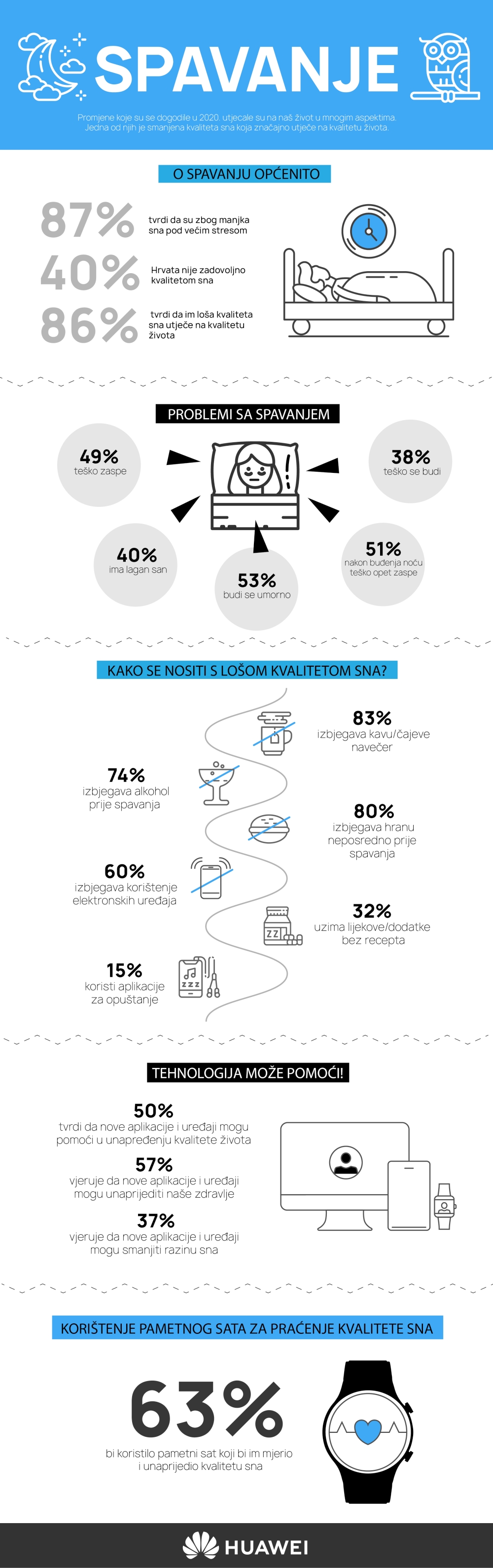 Huawei je u suradnji s istraživačkom agencijom Ipsos proveo veliko europsko istraživanje o promjenama koje su sve zadesile tijekom 2020. godine i njihovom utjecaju na svakodnevicu. Istraživanje je pokazalo kako je kod Hrvata zamijećena rastuća razina stresa i anksioznosti, a u izazove s kojima se suočavaju spadaju i financijski problemi, samoća te niska kvaliteta sna. Nedavno provedena studija donosi pregled najčešćih problema sa snom s kojima se ispitanici suočavaju.