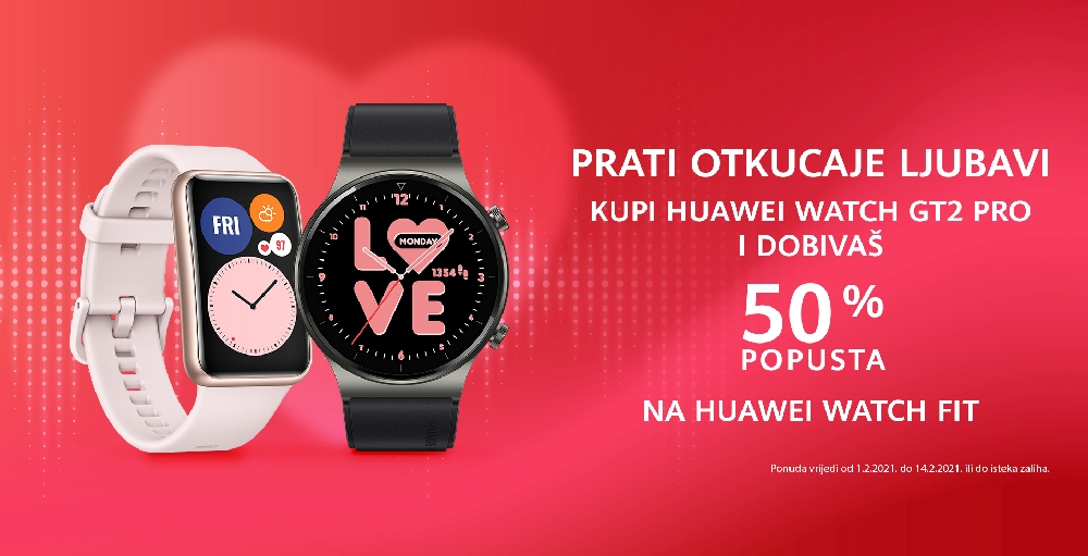 Huawei je za Dan zaljubljenih pripremio posebnu ponudu, a njihove pametne satove sada je moguće nabaviti po još povoljnijim cijenama. Huawei Watch GT 2 je kod prodajnih partnera moguće kupiti po 25 posto nižoj cijeni, dok će oni koji se odluče na Watch GT 2 Pro ostvariti čak 50 posto popusta na Watch Fit pametni sat. Ponuda traje od 1. do 14. veljače, a moguće ju je ostvariti kod Huawei prodajnih partnera.