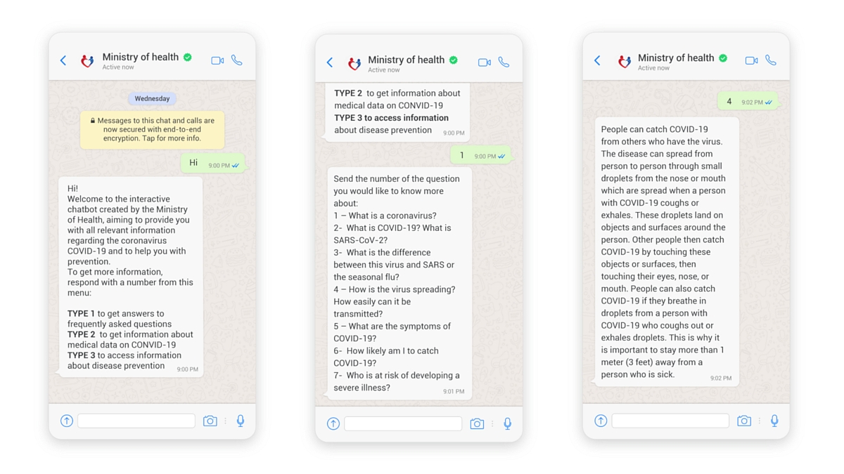 Infobip je tako u suradnji s WhatsAppom, dugogodišnjim globalnim strateškim partnerom, omogućio transparentnu i pravovremenu komunikaciju ministarstava zdravstva s građanima, a sve s ciljem sprječavanja širenja krivih i netočnih informacija vezanih uz koronavirus. Građani su mogli tako na jednome mjestu, putem javno dostupnog broja, odnosno chatbota na WhatsAppu, brzo i jednostavno dobiti provjerene i točne informacije o koronavirusu, ali i najnovije obavijesti oko, primjerice, mogućnosti testiranja, putovanja ili lokalnih mjera.