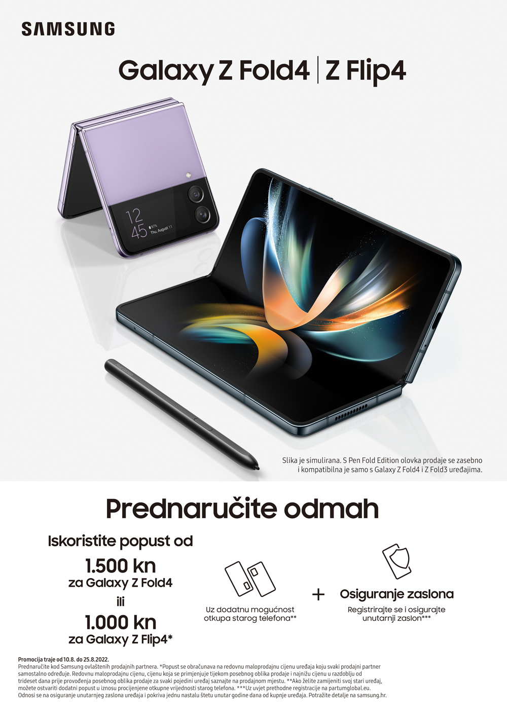 U posebnom promotivnom razdoblju za prednarudžbu Galaxy Z Flip4 i Galaxy Z Fold4 pametne telefone, korisnici su u prilici iskoristiti poseban paket pogodnosti gdje ostvaruju popust u iznosu od 1.500 HRK za Galaxy Z Fold4 Ili 1.000 HRK za Galaxy Z Flip4 uz dodatnu mogućnost otkupa starog uređaja. Također, korisnici koji prednaruče Galaxy Z Flip4 ili Galaxy Z Fold4 ostvaruju mogućnost besplatne zaštite zaslona na jednu štetu unutar prve godine od kupnje. Promocija traje od 10.08.2022. do 25.08.2022. Više informacija o prednarudžbi možete pronaći na linku.